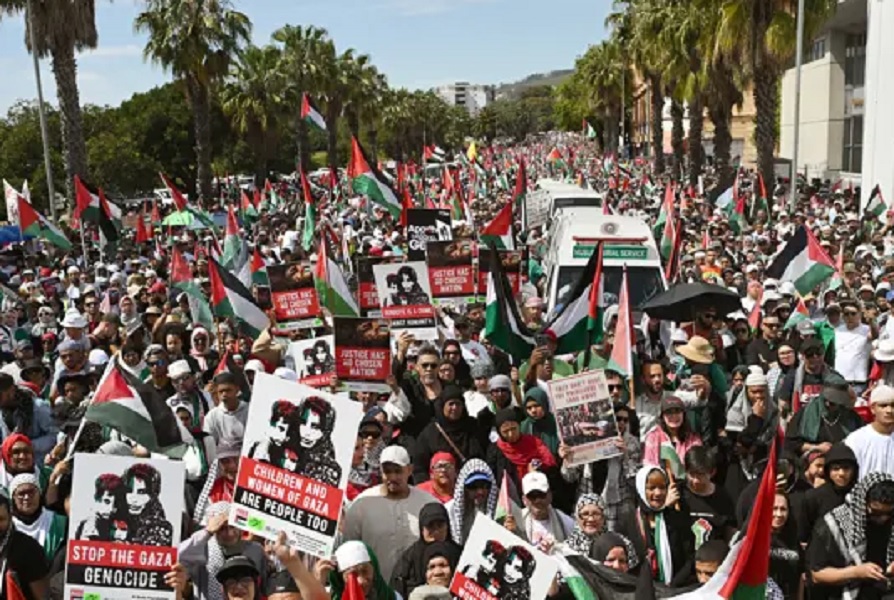 Manifestantes carregaram milhares de bandeiras palestinas e faixas com palavras de ordem como “As crianças de Gaza são inocentes”, “Desmantelem o Estado de Israel”, “Não se sinta mal, faça alguma coisa”. Os participantes se concentraram diante da mesquita Muir Street, no centro da Cidade no Cabo, e marcharam até o parlamento.