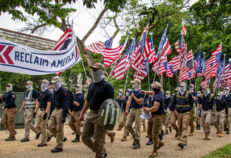 Usando camisas pretas (que tinham nas costas o dístico National Social-ism), integrantes da “Patriot Front” [Frente dos Patriotas] marcharam em Utah no último fim de semana, em homenagem ao ativista trumpista Charlie Kirk, gritando seu nome, como registrado em postagem do Geopolítica Hoje. Há também o detalhe de uma bandeira norte-americana incrustada com o que parece ser alguma variante de uma suástica.