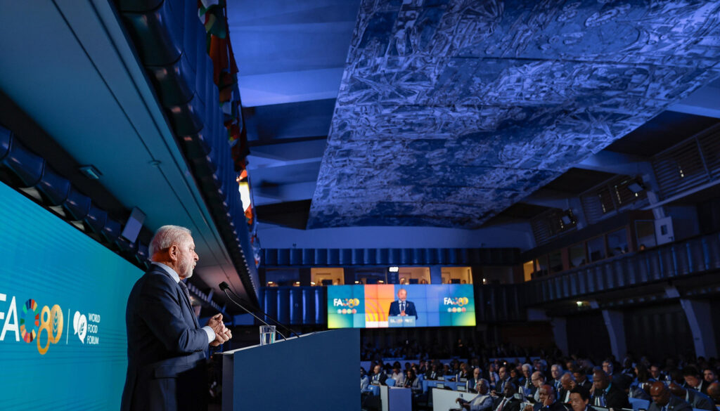 “A fome é irmã da guerra, seja ela travada com armas e bombas ou com tarifas e subsídios”, salientou Lula, ao lembrar da tragédia em Gaza e da paralisia da Organização Mundial do Comércio frente às disputas internacionais (como o tarifaço).