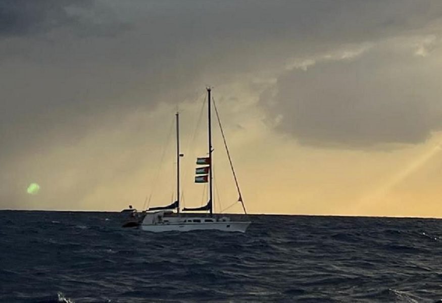 Barco da Flotilha fotografado ao anoitecer rumo a Gaza | Foto: AA