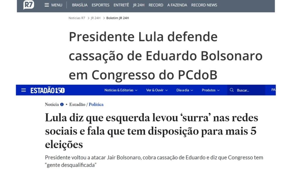 Já outra mídia consumida pela direita, o Estadão, foi mais sensacionalista (igualmente fizeram CNN e UOL), ao acentuarem trecho dito pelo presidente que a esquerda levou ‘surra’ nas redes sociais. Por outro lado, o jornal exaltou passagem em que Lula diz ter “disposição para mais 5 eleições”.