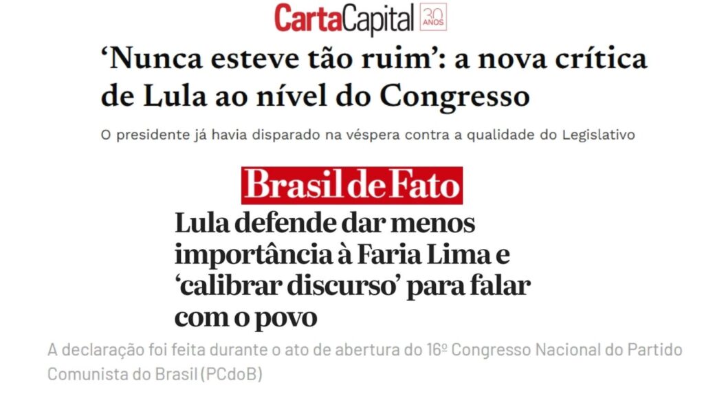 O campo das mídias progressistas também tratou do ato do PCdoB com Lula. A Carta Capital, em textos diferentes, frisou a fala de João Campos, o rechaço à interferência dos EUA em outros países e a crítica de Lula à situação do Congresso Nacional: ‘Nunca esteve tão ruim’.