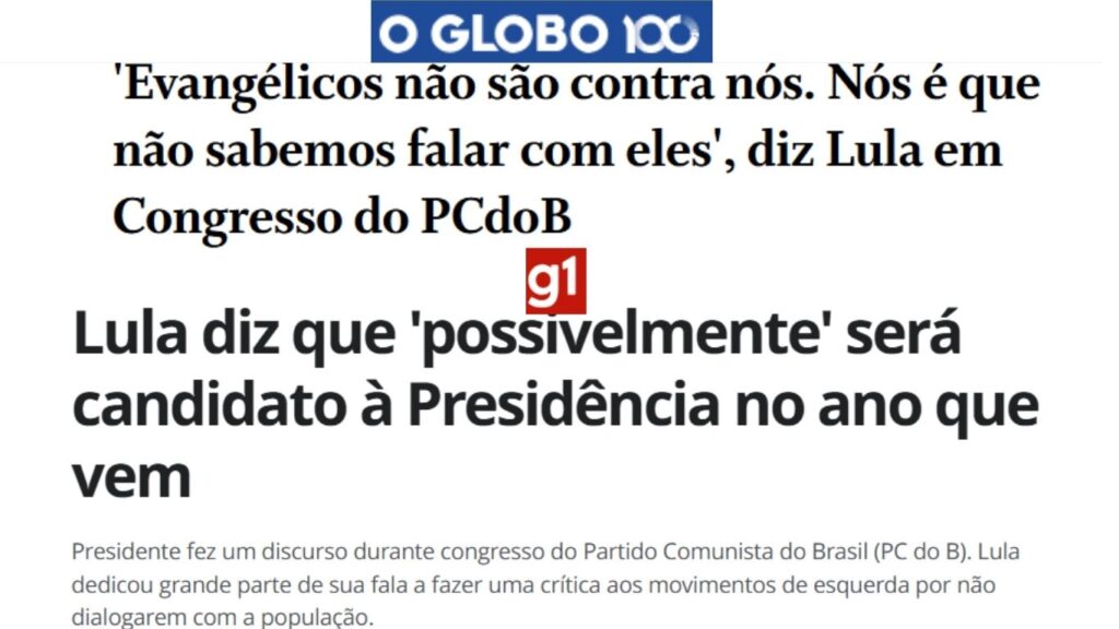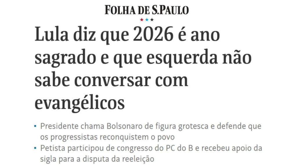 Por sua vez, a Folha de São Paulo deu ênfase ao apoio dos comunistas à reeleição do presidente e ao ‘sagrado’ 2026 como forma de eleger mais parlamentares do campo progressista, bem como indicou passagem em que Lula pede o aperfeiçoamento do diálogo com evangélicos.