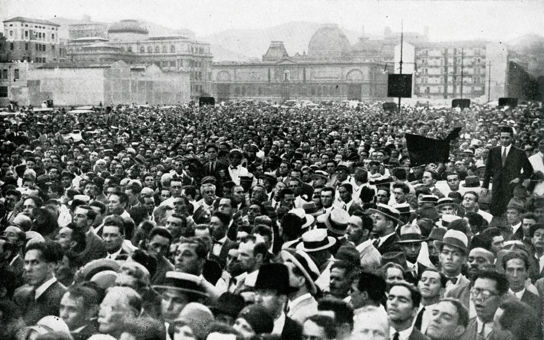=Comício de Getulio Vargas atrai milhares de pessoas para a Esplanada do Castelo, no Rio de Janeiro, durante a campanha eleitoral de 1930. No mesmo local, alguns anos depois, seria construída a sede do Ministério do Trabalho, Indústria e Comércio. Fonte: reprodução da revista Careta n. 1.125.