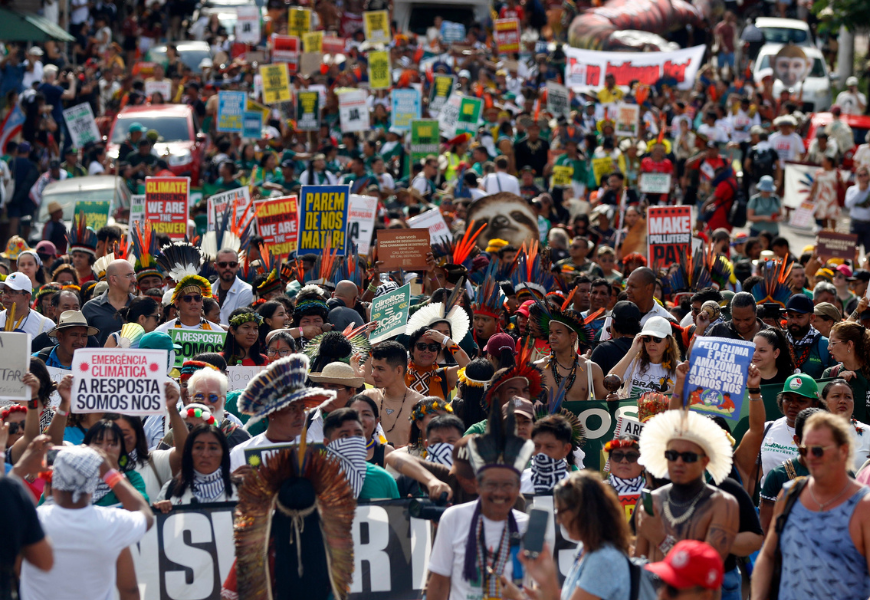 No sábado (15), cerca de 70 mil pessoas participaram da Marcha Mundial pelo Clima, percorrendo 4,5 km desde o Mercado de São Brás até a Aldeia Cabana, sob forte calor amazônico. Máscaras de Chico Mendes e Raoni, alegorias do Boitatá, carros de som com discursos, carimbó e brega compuseram uma estética orgânica entre luta e identidade regional. A marcha foi apoiada por representantes de todos os continentes e movimentos de diversas matrizes — indígenas, periféricos, camponeses, ribeirinhos e juventudes urbanas.