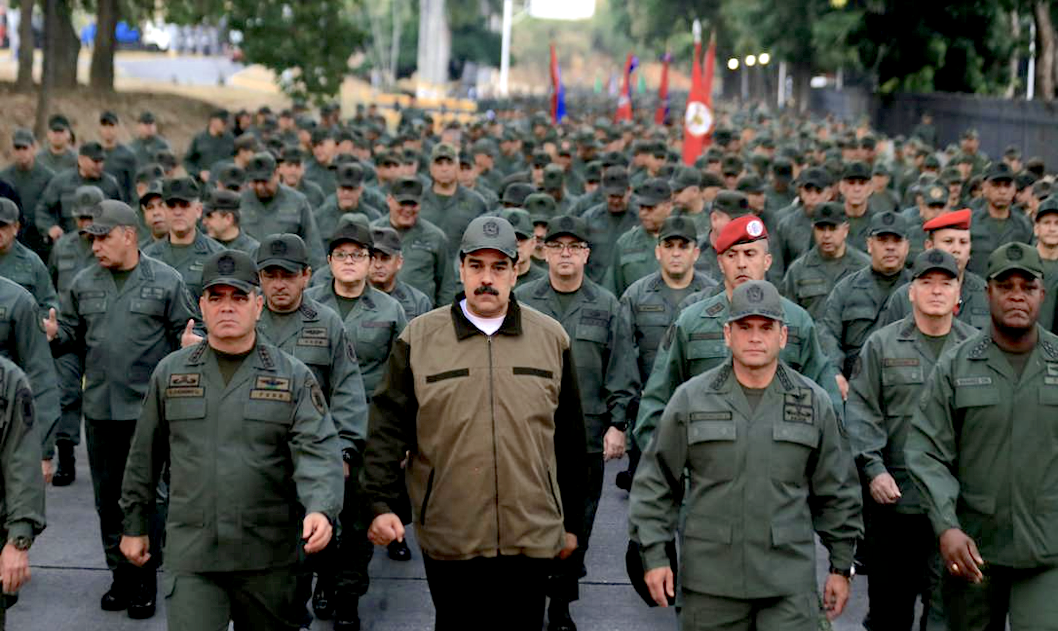 O presidente Nicolás Maduro (centro) desfila ao lado do ministro da Defesa, Vladimir Padrino (à esquerda), à frente de forças militares em Forte Tiuna, Caracas, no início de 2019