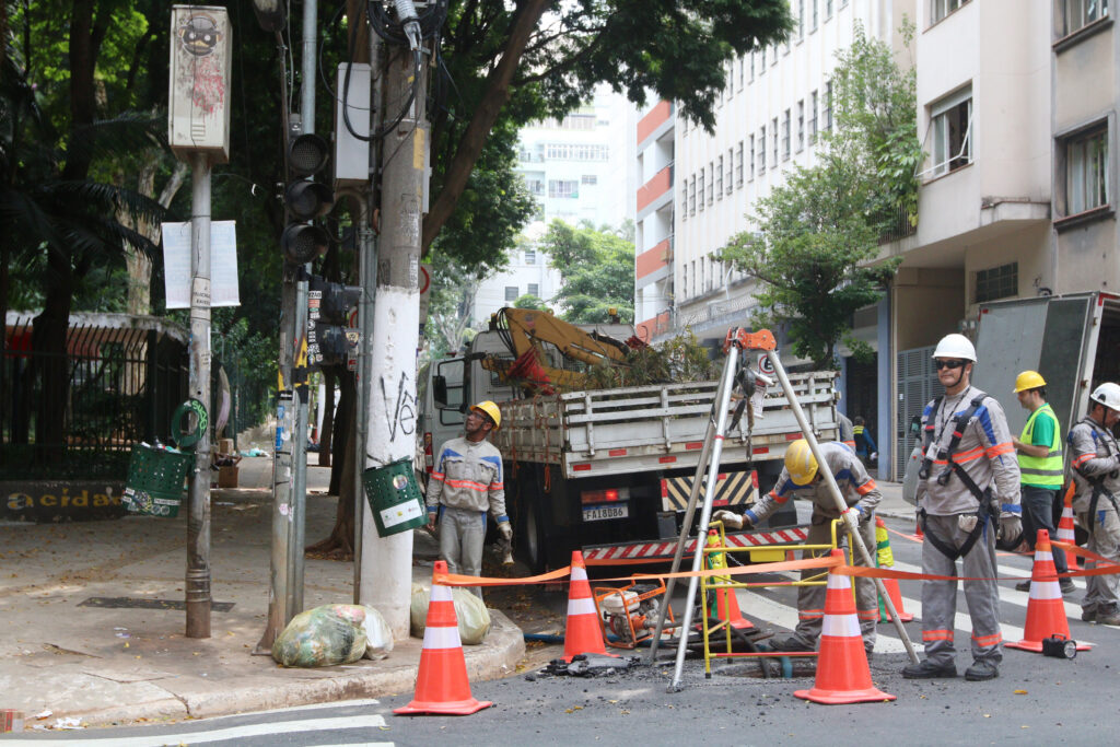 Funcionários da Enel trabalham na rua General Jardim, em Vila Buarque, durante falta de energia na região central | Foto: Rovena Rosa/Agência Brasil