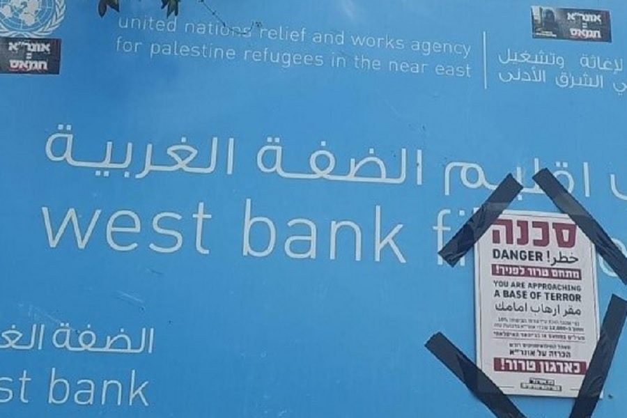 Cartaz israelense afixado à entrada de agência da ONU diz “Perigo, Base de Terror” | Foto: WAFA