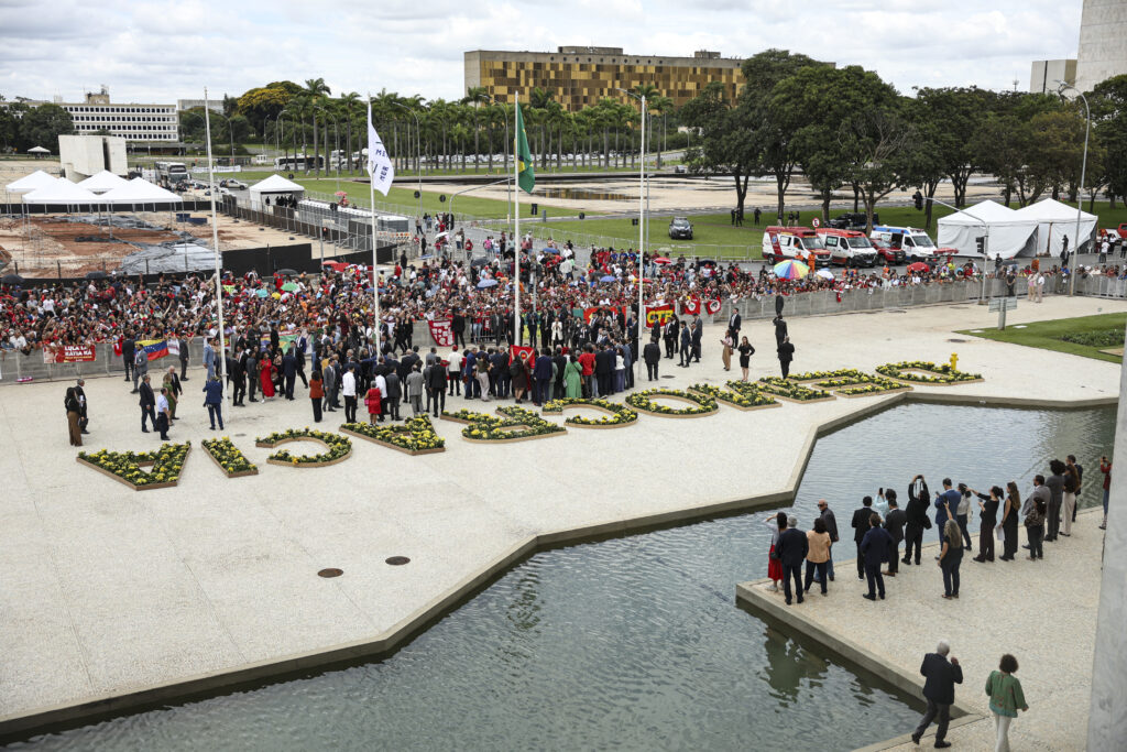 Encerradas as atividades em Brasília, o presidente Lula desceu a rampa do Palácio do Planalto acompanhado de ministros e representantes dos Três Poderes, em um gesto simbólico de unidade institucional, diante de uma instalação formada por vasos de flores que desenhavam a palavra “democracia”.