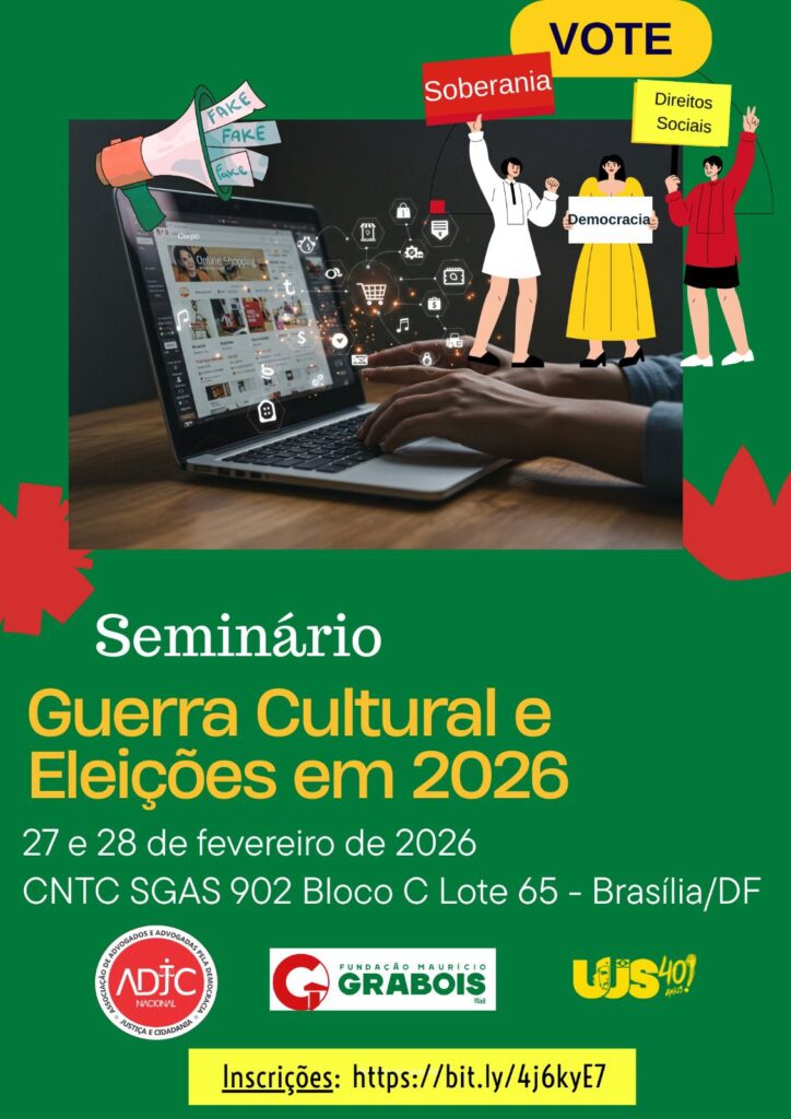 A guerra cultural e as eleições de 2026 é tema de seminário que acontece nos dias 27 e 28 de fevereiro, com transmissão online. A atividade é uma realização da Associação dos Advogados e Advogadas pela Democracia, Justiça e Cidadania (ADJC), com o apoio da Fundação Maurício Grabois e da União da Juventude Socialista (UJS).