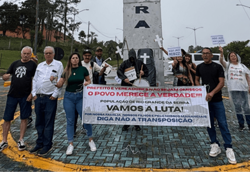 Moradores, comerciantes e ativistas realizaram no sábado (14) mais uma mobilização em Rio Grande da Serra contra as obras de transposição do Rio Pequeno, projeto ligado à Sabesp que prevê transferir água da Represa Billings para a Represa de Taiaçupeba, em Mogi das Cruzes, e que tem sido alvo de críticas por avançar, segundo manifestantes, sem estudos ambientais obrigatórios e sem debate público.