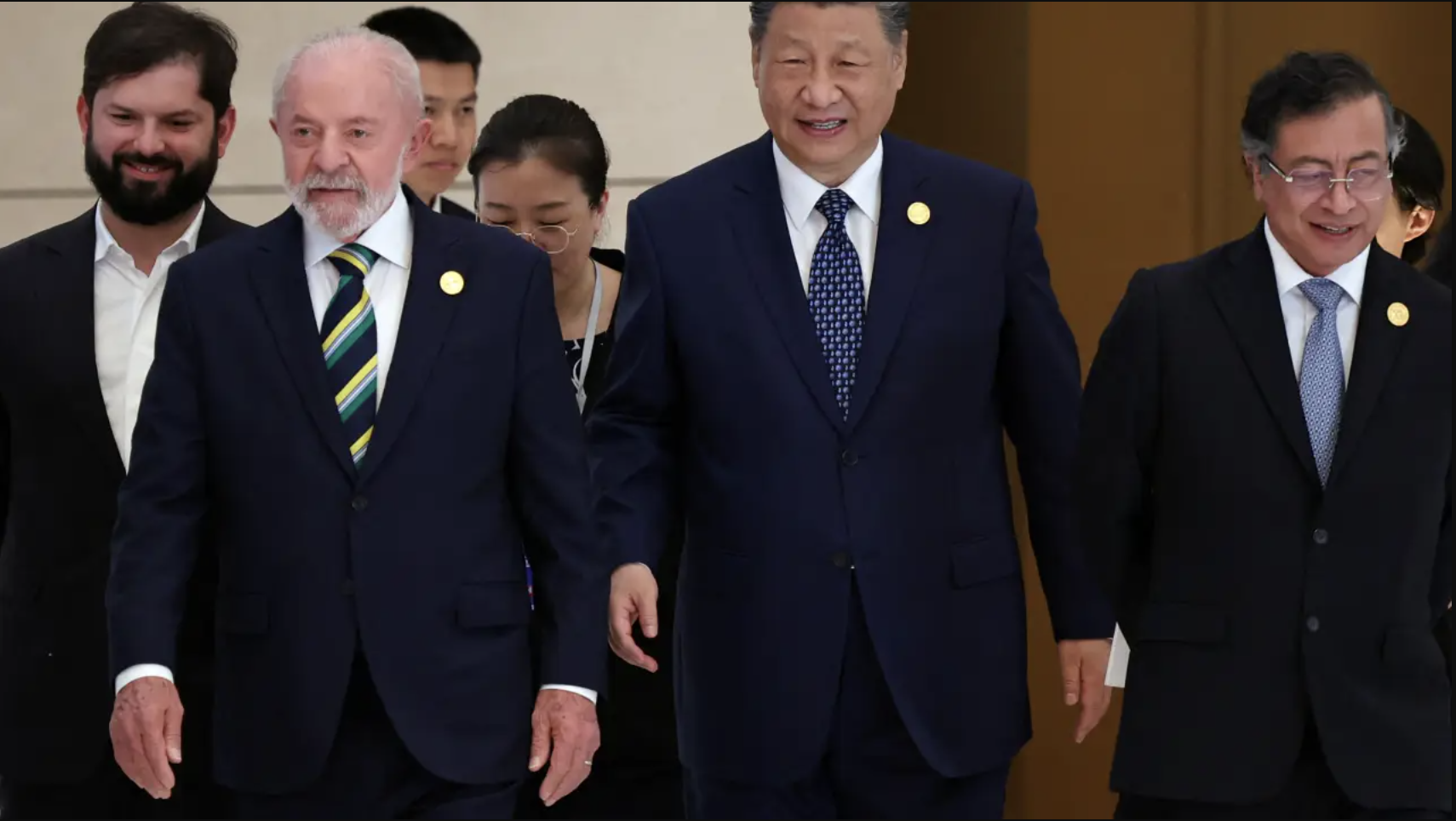 O presidente chinês, Xi Jinping (centro), o presidente Luiz Inácio Lula da Silva (segundo esq.), o presidente chileno, Gabriel Boric (esq.), e o presidente colombiano, Gustavo Petro (dir.), participam a Quarta Reunião Ministerial do Fórum China-Comunidade dos Estados Latino-Americanos e Caribenhos (CELAC), em Pequim. 13/05/2025