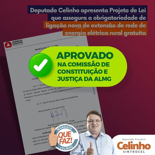De autoria do deputado estadual Celinho Sintrocel (PCdoB-MG), a Assembleia Legislativa de Minas Gerais (ALMG) aprovou, na última terça-feira (3) o projeto de lei (PL) que visa assegurar a obrigatoriedade de ligação nova de extensão de rede de energia elétrica rural gratuita, desde que o consumidor comprove a posse do imóvel, como já previsto na resolução normativa da Agência Nacional de Energia Elétrica (Aneel).