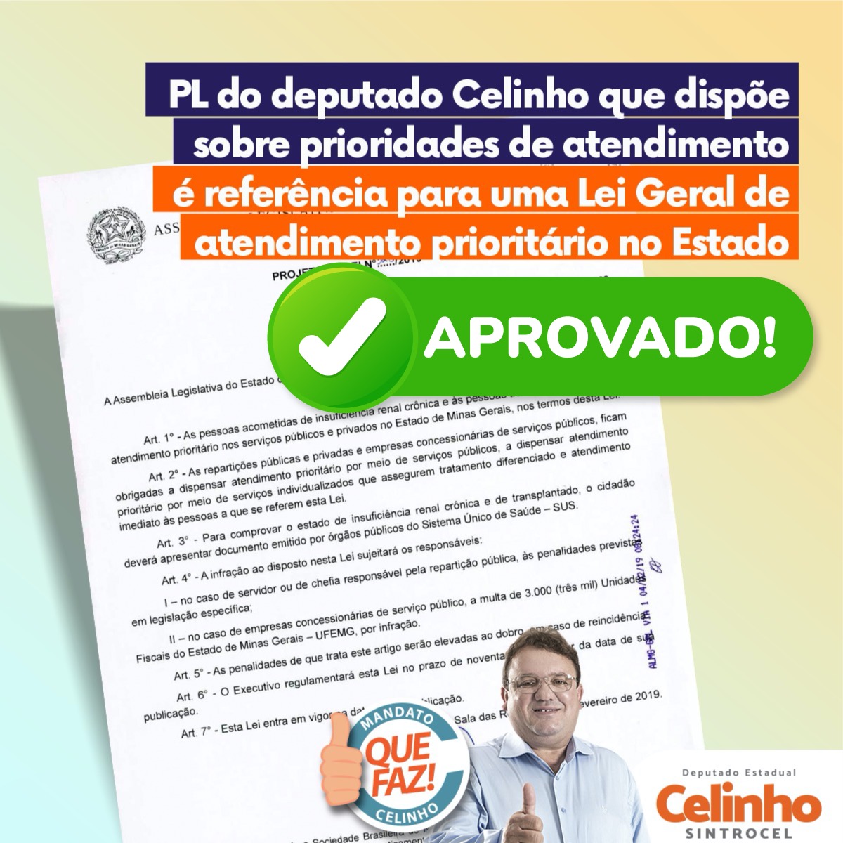 Originalmente o projeto dispunha sobre prioridades de atendimento para “pessoas com problemas renais e pessoas transplantadas”, mas recebeu substitutivo da Comissão de Justiça e uma emenda da Comissão de Saúde que ampliou a prioridade de atendimento incluindo outros portadores de necessidades e outras doenças debilitantes. O PL do deputado Celinho consolida, desta forma, a Legislação sobre o tema, criando uma “Lei