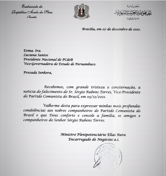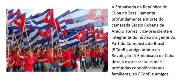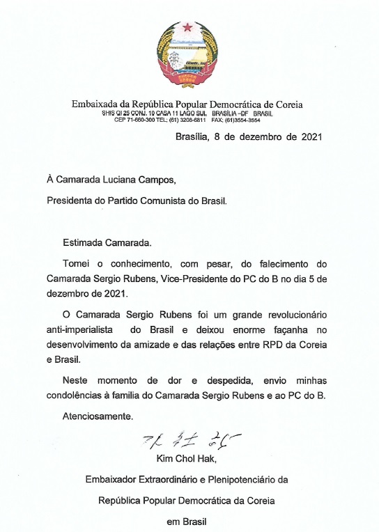 O Partido Comunista do Brasil (PCdoB) recebeu mensagens de condolências das embaixadas de Cuba, da Coreia Popular e da República da Síria, pelo falecimento, aos 73 anos, do vice-presidente nacional do Partido, Sérgio Rubens, ocorrido neste domingo (5). Confira as mensagens.