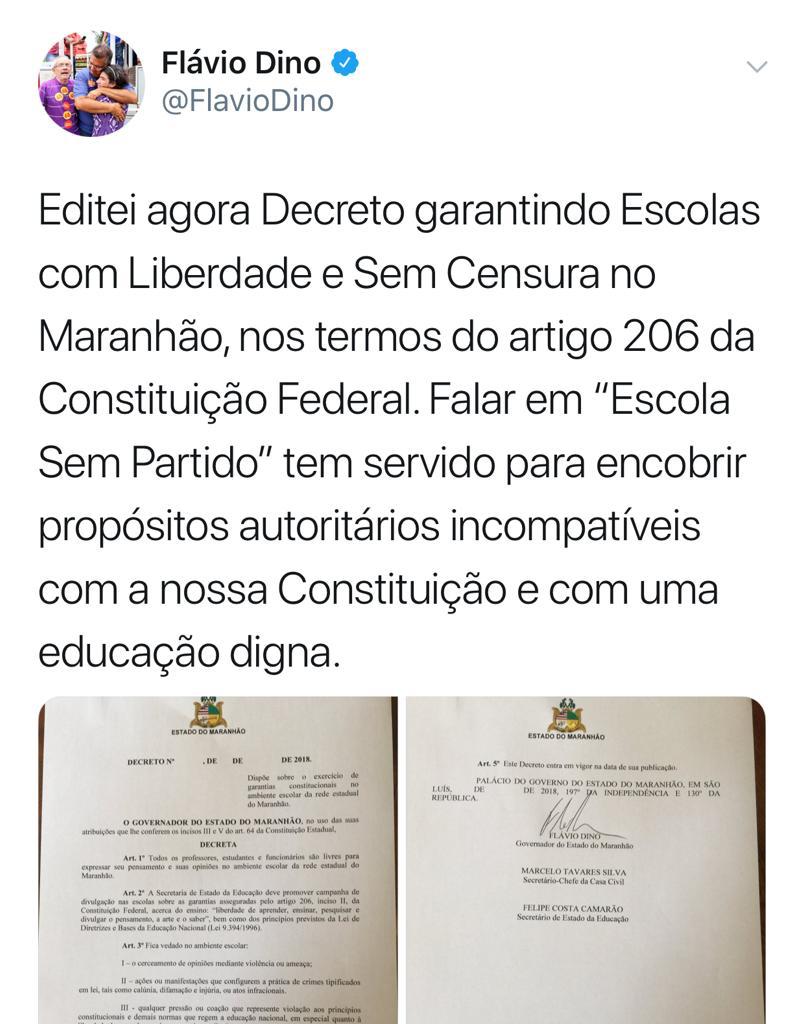 Flávio Dino decreta Escola com Liberdade e Sem Censura no Maranhão