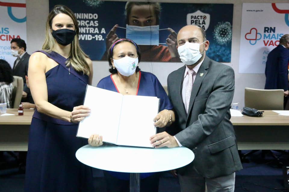 Júlia Arruda, nova secretária da Semidh, a governadora, Fátima Bezerra e o vice-governador, Antenor Roberto (PCdoB-RN) | Foto: Sandro Menezes