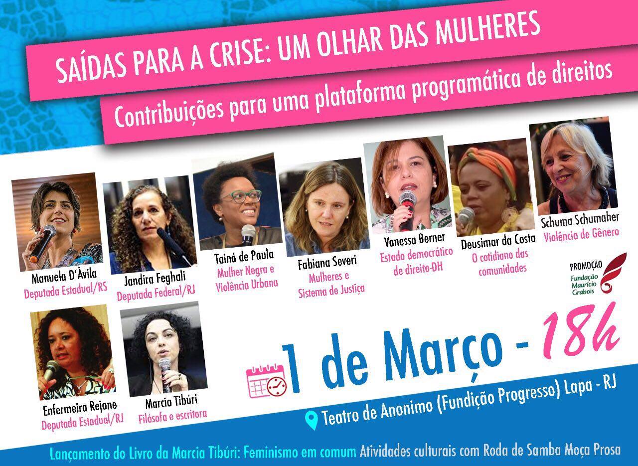 Com  objetivo de contribuir para formulação de uma plataforma programática de direitos sociais e de gênero, lideranças feministas se reúnem para encontrar saídas para a crise com a participação de Manuela D’Ávila no debate um olhar das mulheres. O evento acontece no Rio, nesta quinta-feira (1º), às 18 horas, no Teatro de Anonimo, no bairro da Lapa. O seminário é promovido pela Fundação Maurício Grabois.  A participação no evento pode ser confirmada através do evento no Facebook: link.