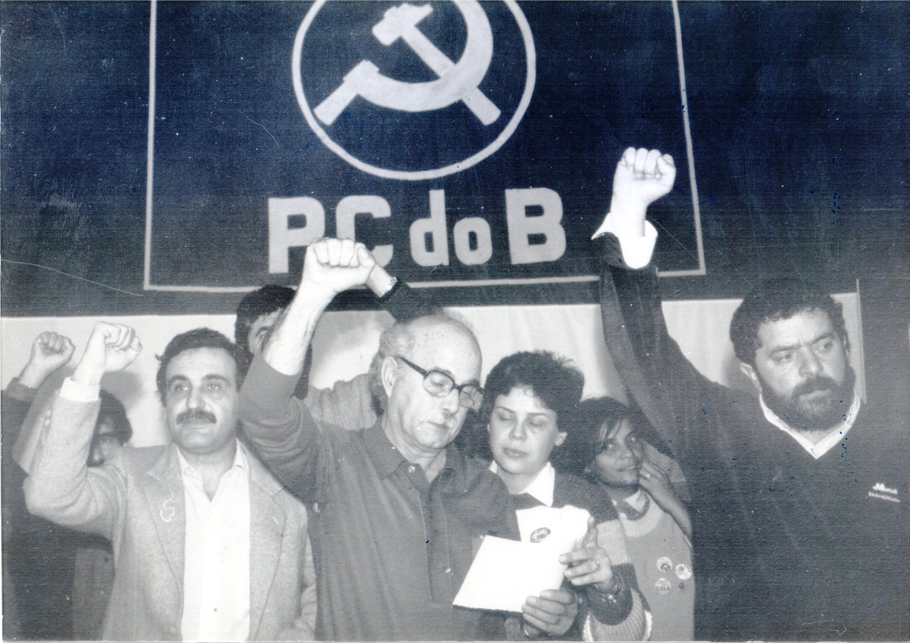 Na foto, Inês aparece auxiliando a mesa na convenção que homologou o apoio do PCdoB a Lula e a formação da Frente Brasil Popular em 1989.