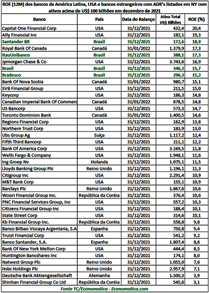 Quatro bancos brasileiros estão entre os 10 com maior rentabilidade do mundo. Santander Brasil, Itaú Unibanco, Bradesco e Banco do Brasil são as instituições que aparecem no ranking com 39 bancos recém-divulgado pela consultoria Economatica, que considera para a lista aqueles que tem mais de US$ 100 bilhões em ativos e posiciona os bancos conforme seus Retornos sobre Patrimônio Líquido, ou Returno On Equity (ROE), em inglês.